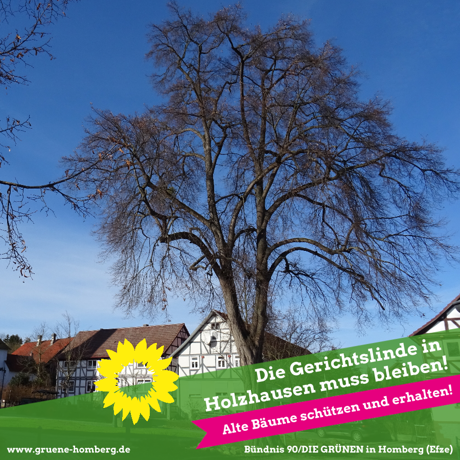 DIE GRÜNEN fordern den Erhalt der Linde in Holzhausen. Alte Bäume haben einen hohen ökologischen Wert und können nicht einfach durch Neuanpflanzungen ersetzt werden, die wieder Jahrhunderte brauchen, bis sie die Größe und Bedeutung eines alten Baumes erreicht haben. Die Gerichtslinde in Holzhausen muss bleiben!